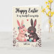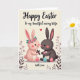 Designed with two stylized rabbit-like figures centered on a soft cream background, this card sets a gentle Easter scene 🐰. One figure is pale pink with rosy cheeks and a small flower wreath, holding a simple dark cross close to its chest as it leans toward its companion. The other figure is deep brown and cradles a striped egg in bright bands, angled as if offering it with a quiet, friendly affection 🐇. A few decorated eggs rest near their feet, adding small touches of color across the lower area. A single red heart floats above them, visually tying the pair together like a shared secret. Light blush flowers and leafy sprigs frame the edges, keeping the focus on the two characters while suggesting early spring. The greeting text sits across the top in a dark, flowing style, standing out clearly against the pale background. The pale pink figure’s floral circlet shows tiny petals in blush and cream with small green leaves.