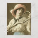 Vintage colorized photograph of a pretty young woman holding a tennis racket.