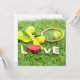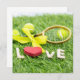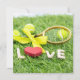 Tennis ball and racket on green grass with love flat card