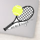 Personalized Name Contour Cut Sticker with Tennis Racket and Ball Monogram in a Girly, Feminine, Elegant Calligraphy Script Font is available in several sizes for your laptop, water bottle, sticker collection or as favors and gifts for a tennis birthday party.