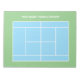 Tennis court layout notepad for training coach. Paper tear off memo note pad with tennis court dimensions design. Custom office and school supplies for lessons. Large size for making notes on tactics, improving game strategy, techniques, player movement in singles and doubles, serve direction, court positions etc. Personalized tennis club materials for sports coach, teacher, trainer, captain, kids' team, league etc. Useful Birthday gift idea for teaching kids and adults. Customizable background colors. Green and blue example.