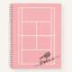 Girly and feminine personalized tennis design notebook with a tennis court outline and custom name in an elegant script calligraphy handwriting font and tennis racket and tennis ball monogram logo. The pink, black, and yellow colors can be customized using the advanced template editor to create a unique and one of a kind gift for the tennis lover, player, teammate, or coach.