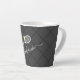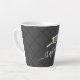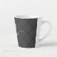 Black and white personalized black latte style coffee mug with a tennis racket monogram in an elegant and cute calligraphy script font with a subtle net pattern background with a modern and streamlined, minimalist look.