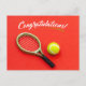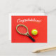 Tennis racket and ball congratulations on red postcard