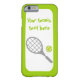 Tennis racket and ball custom iPhone 6 case. This cool design features a grey racket, a green tennis ball and your text on white background with green border. The perfect gift for the tennis player or tennis lover in your life. Some elements courtesy of vectorportal.com.