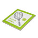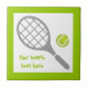 Tennis racket and ball tile that features a grey racket, a green tennis ball and your text on white background with green border. This cool design is a template and it is completely customizable. The perfect gift for the tennis player or tennis lover in your life. Some elements courtesy of vectorportal.com.