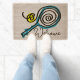 Tennis racket and ball personalized coco coir Fiber Doormat design. Trendy entry rug made from coconut fiber. Stylish home decor for beautiful home, shop, business, office, hotel, sports club, stringer etc. Personalize with custom name or greeting. Cute tennis racquet drawing.