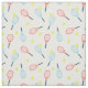 Cute fabric with illustrated tennis rackets and tennis balls pattern. White background.