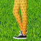These are fun tennis-patterned leggings with a background in orange merging into yellow. The repeating pattern is created with crossed red-rimmed tennis rackets and yellow tennis balls, on an ombre background.