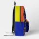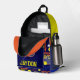 Tennis sports orange white blue yellow custom name backpack. Sports tennis ball and racquet on a dark blue background personalized name bag. This typographical sports-themed patterned bag has tennis balls and racquets hitting the balls with dark blue, orange, yellow, light yellow and white text. This fun sporty design can be customized with your own name, currently reads Jaydon. Other sport balls in this style and colors options are available or can be created by request. Designed by Sarah Trett for www.mylittleeden.com on zazzle.