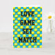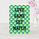 A playful anniversary for a couple who love tennis! Love, game, set, match. Yellow tennis balls on a vibrant blue background. The message inside can be personalized with a name or message of your choosing.