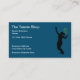 Unique modern Tennis theme business card template designed with a cool tennis player in serving action position and simple layout you can customize online. Created for a tennis Pro, instructor, class, or club.