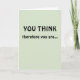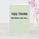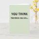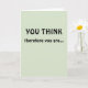 Celebrate a major professional achievement of your colleague, friend, or loved one with this card! The message is a play on the philosopher René Descartes' phrase "Je pense, donc je suis [I think, therefore I am]" ("cogito ergo sum"). The front of the card reads: "YOU THINK," followed by "therefore you are..." Opening the card, the wording continues: "TENURED! Congratulations!" The front of the card is pale green, and the message appears in black lettering. Perfect for anyone upon getting academic tenure!