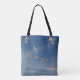 The original photograph by ZoeSPEAK on this Tote Bag captures a flock of terns taking off from the beach, heading out over the ocean. The white birds, in the light of the late afternoon sun, stand out against the deep blue sky. The terns have black feathers on their heads and wing edges, and forked tails like swallows’ tails.