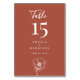This Terra Cotta Elegant Floral Wedding Reception 3.5x5 Table Number showcases a large table number in white on a terra cotta background, with modern typography and script calligraphy, and a line art floral accent. It is fully customizable with the table number, couple's names, and wedding date.
