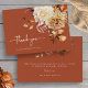 Terracotta Autumn Thank You Card. Express your gratitude with timeless charm using this thank you card, featuring graceful script lettering framed by hand-painted watercolor artwork of terracotta and burnt orange leaves, soft cream and beige dahlias, and rich copper and rust-colored roses. Set on a warm copper background, it beautifully mirrors your autumn wedding aesthetic while leaving room for a heartfelt message inside. Finish your celebration with elegance—customize your thank you cards today.