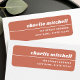 Return address labels with your name in a retro style font and a thin border between your name and return address. The is text aligned to the right, white text on a terracotta brown background.