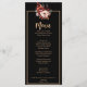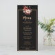 A fancy fall autumn black moody terracotta burnt orange floral wedding dinner menu. Which features burnt orange and ivory beige cream flowers as peony and fall leaves.