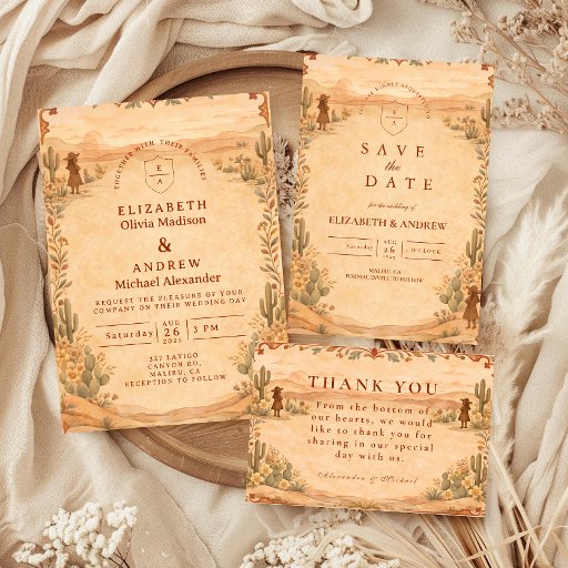 Set the scene for a romantic desert celebration with this refined western wedding design, featuring a warm terracotta palette, soft vintage textures, and a beautifully illustrated landscape framed by delicate florals and cacti. The subtle desert vignette adds depth and storytelling, creating an invitation that feels both artistic and timeless.