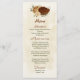 Beautiful earth tone fall wedding menu card featuring terracotta, beige and cream flowers with green leaves .