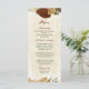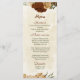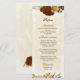 Beautiful earth tone fall wedding menu card featuring terracotta, beige and cream flowers with green leaves .