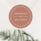 Modern terracotta and white bride and groom name wedding envelope seals with a simple botanical wreath around the border. The minimalist design features a classic typography font for the names and a stylish calligraphy script for the center text.