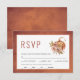 Terracotta flowers and pumpkin fall all in one wedding RSVP response card. This lovely wedding design features a frame on terracotta stained background. In the frame there is a bouquet of terracotta flowers and a pumpkin.