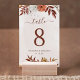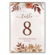 Modern bohemian style wedding table numbers featuring watercolor flowers and fall leaves in earthy tones like rust brown, burnt orange and terracotta. Perfect choice for autumn weddings.