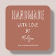Customizable modern minimalist handmade by stickers. Features modern white typography on a modern terracotta orange background. Add your website address or social media handle to promote your business.