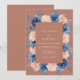 The design features a rich terracotta hue that creates a warm, earthy atmosphere. Lush peonies and roses in contrasting dusty blue and soft peach tones are arranged to create a striking visual balance. Delicately painted foliage in muted grey-blue shades weaves through the florals for added depth and elegance.