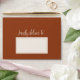 An elegant terracotta-colored envelope that perfectly coordinates with my wedding collection. Handwritten calligraphy with the phrase "kindly deliver to" appears on the front with a light-colored text box to add your guests' names and addresses. Personalize the back flap of the envelope with the couple's initials and return address. © Kimbellished, LLC