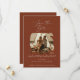 Simple, minimalist design with a deep burnt orange, terracotta, Sienna toned background and a watercolor brush stroke framed opening to customize your engagement photo. A calligraphy handwriting script font with flourishes is used for the "Save the Date," title. Art graphically designed by internationally licensed artist and designer, Audrey Jeanne Roberts, copyright.