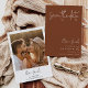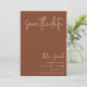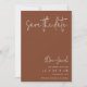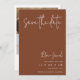 Modern terracotta colored save the date card featuring a modern calligraphy heading and the couples photo on the back along with some text. Ideal for a couple looking for a modern terracotta wedding save the date and like modern calligraphy text.