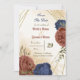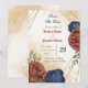 Beautiful earth tone fall save the date invitations featuring terracotta and navy blue flowers with green leaves . The gold glitter details are simulated. FOR MORE MATCHING PRODUCTS click on the collection above or contact me