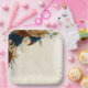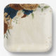 Beautiful earth tone fall paper plate featuring terracotta, beige and navy blue flowers with green leaves .
