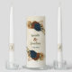 Beautiful earth tone fall wedding Unity Candle Set featuring terracotta, beige and navy blue flowers with green leaves .