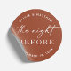 Warm and earthy, this elegant terracotta round sticker featuring the phrase “The Night Before” is perfect for boho, rustic, or fall themed weddings. The rich clay orange background adds a cozy, modern touch to your rehearsal dinner decor. Use this versatile sticker to seal envelopes, decorate favor bags, or personalize welcome gifts. Ideal for couples embracing warm tones, desert inspired palettes, or outdoor autumn wedding celebrations.