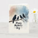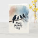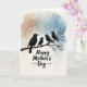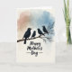 Designed with a tender family scene, the card shows four sleek bird silhouettes perched on a sturdy bare branch, the larger one angled toward three smaller companions as if keeping them close ❤️. The birds are deep matte black with small white eyes, and one of the little ones sits nearest the larger bird, adding a gentle, affectionate closeness. Behind them, soft watercolor-like washes blend warm terracotta into muted sky-blue, creating a calm dawn-or-dusk setting. The layered color bands ripple lightly across the background, giving the scene depth without distracting from the quiet interaction on the branch. Beneath the illustration, a short Mother’s Day message sits centered near the bottom in dark lettering that stands out clearly against the pastel field 🌼. The branch has a lightly textured look with subtle feather-like hints along the birds’ edges, keeping the artwork simple and intimate. The text area leaves generous space around the words, and the lower-middle composition keeps the birds as the main focus above the centered message. The overall palette stays soft with terracotta on one side fading into blue on the other, while the black branch cuts across the lower portion of the front.