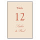 Terracotta Straw Beige Wedding Table Number featuring elegant traditional style lettering. The design automatically copies across to the other side of the card so that both sides are identical. Please edit the name of the couple and the table number in the online personalization template as appropriate. Please add to the cart individually for each number that you require (please edit the number and the names each time).