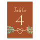 Boho, modern, simple calligraphy terracotta burnt orange table number, with gold rope heart and rustic watercolor eucalyptus greenery.