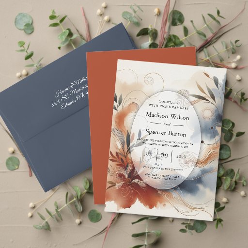 Plain white envelopes are included with paper invitations and will come to fit the invitation size you select. If you don’t need the envelopes, you may choose to not receive them by selecting the dropdown below "Envelopes" and choosing "None." If you’d like to have a design on your envelopes, you can browse all of these available envelopes to find the design that complements your Terracotta Twilight And Navy Blooms Wedding Invitation.