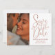 This terracotta elegant script wedding save the date invitation can be personalized with your 2 special photos and wedding day information and wedding website QR code. Designed by Thisisnotme©