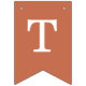 A simple bunting flags banner for a terracotta wedding, with the names of the bride and groom, with white caps on terra cotta brown background.