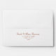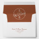 Simple, elegant, modern, bohemian burnt orange terracotta 5x7 envelope for wedding invitation with monogram inside, return address and unique romantic couple love birds drawing.