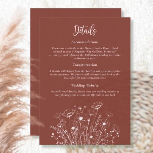 This terracotta and white enclosure card provides all the details for your guests. The bold white script and the white wildflowers create an elegant boho theme for your wedding day. All information is able to be customized and a QR code on the back is available to give your guests the ability to see more information on your website