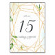 Chic table number cards feature a golden geometric border accented with green watercolor leaves and foliage, framing your table number in gray. Personalize with your names and wedding date, or name each table for an extra personal touch. Design repeats on reverse side. Coordinates with our Terrarium wedding invitation suite.