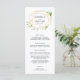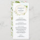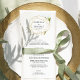 Our garden chic wedding menu features your starter courses, entrees and desserts in elegant lettering, with your names and wedding date encircled by a golden geometric border accented with lush green watercolor foliage. Coordinates with our Terrarium wedding collection.