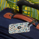 A terrazzo style design featuring random shapes in a range of sizes and colors. Personalize with an initial.
