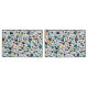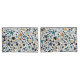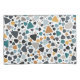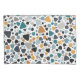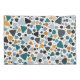 A terrazzo style design featuring random shapes in a range of sizes and colors.