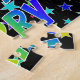 This vibrant and fun birthday-themed jigsaw puzzle design has the message "HAPPY BIRTHDAY, TERRY" with the characters having a colorful rainbow spectrum inspired gradient pattern, along with a lively star field background pattern. An exciting puzzle like this might be used to send birthday greetings to somebody named Terry. [~Z0000468]